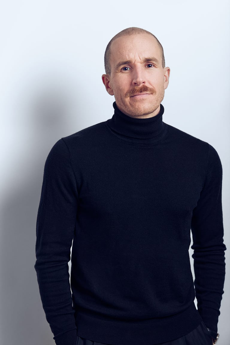 A man in a black turtle neck smiling.